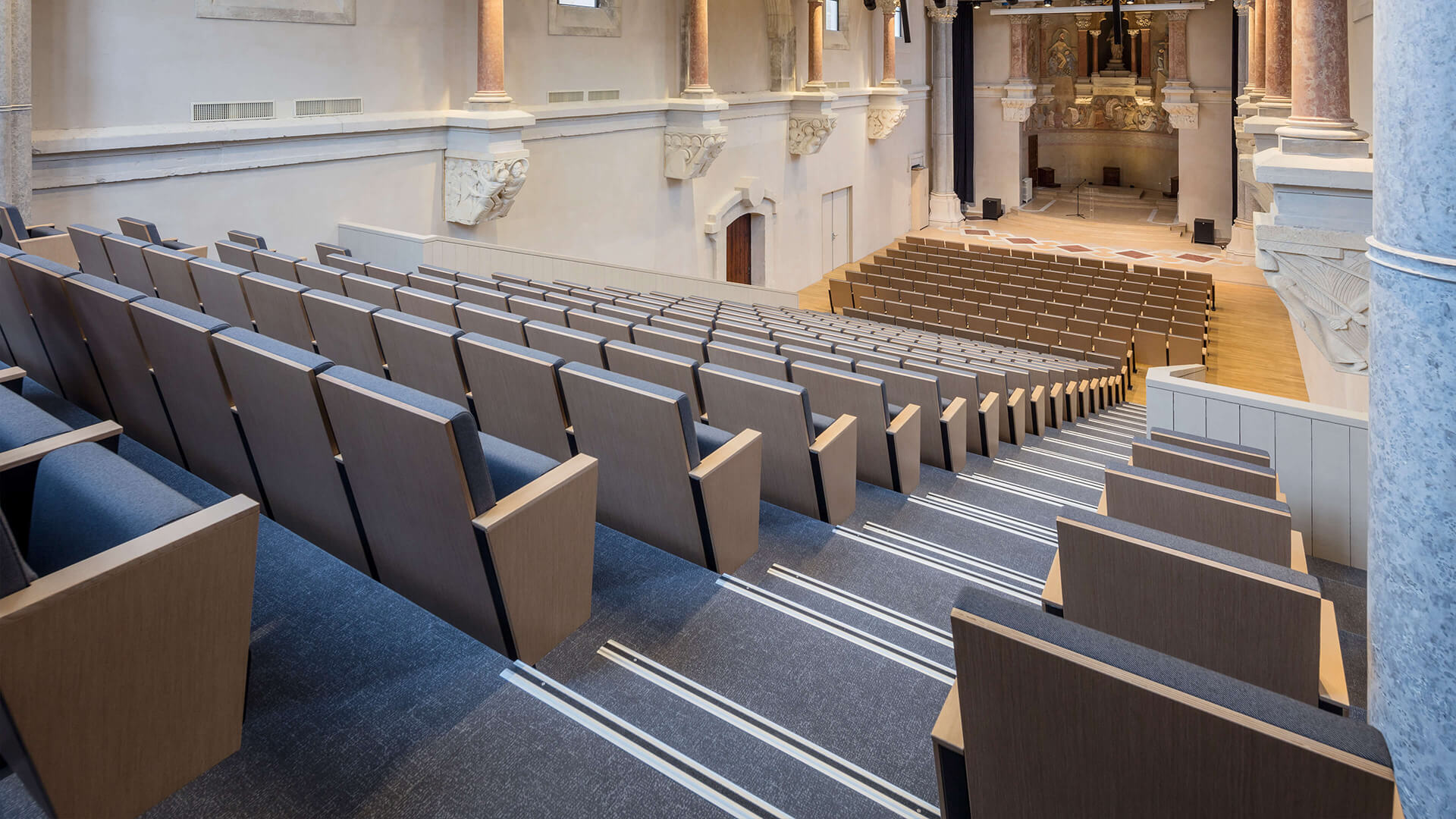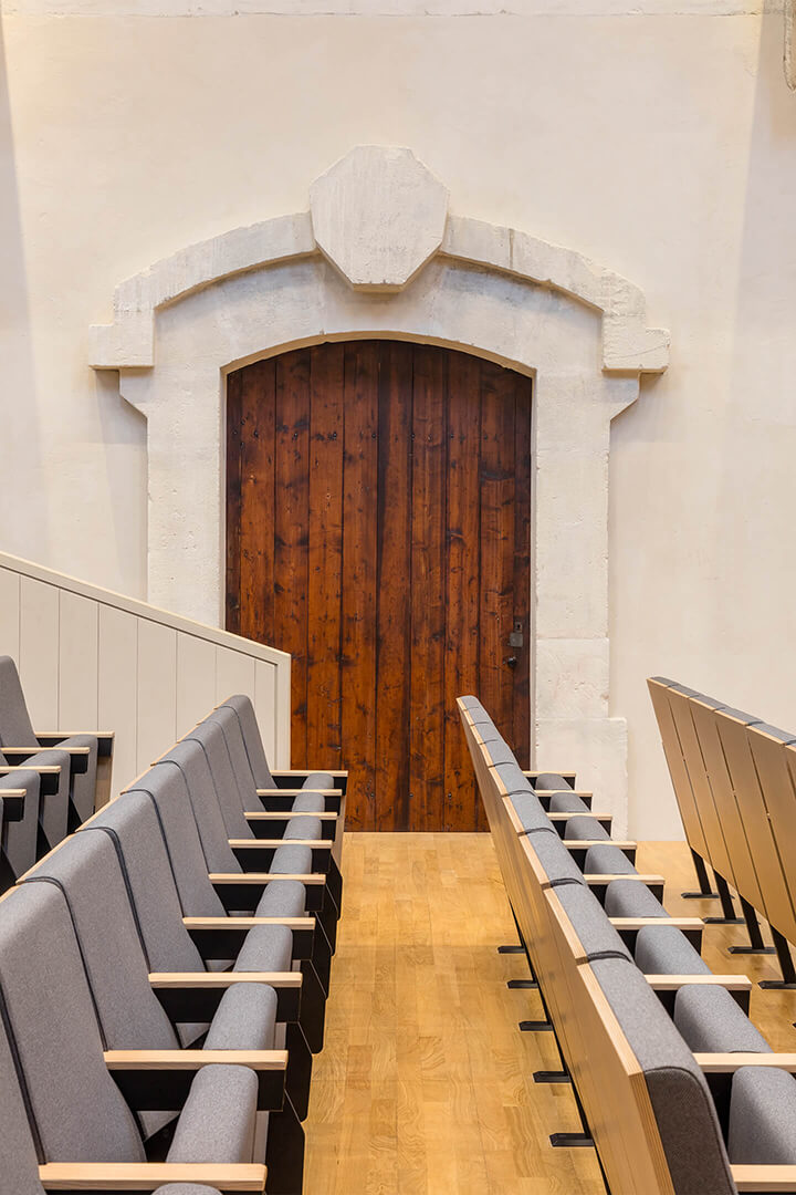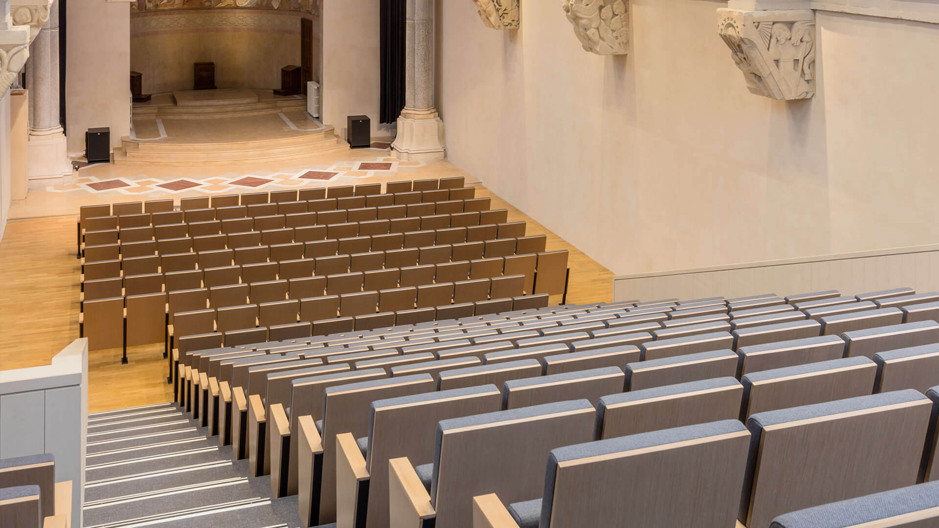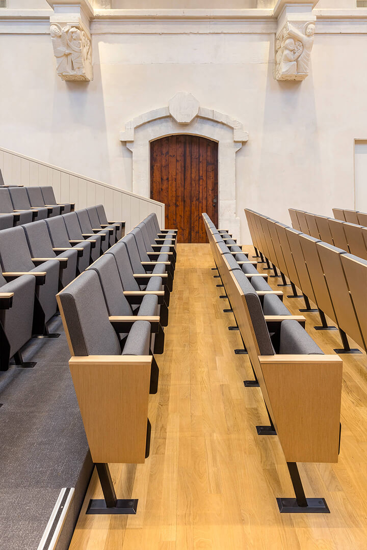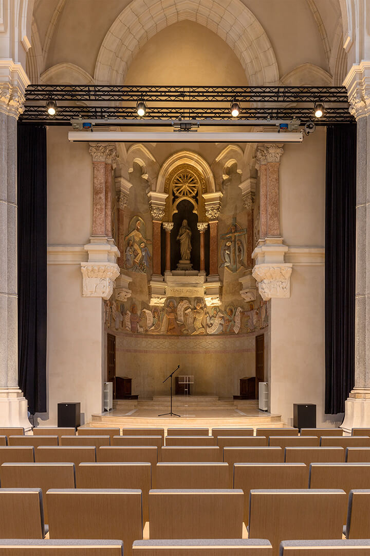 El campus, que alberga a más de 700 alumnos, se inauguró en 2019 y se amplió en 2024 con importantes instalaciones: una biblioteca, un anfiteatro y un gran auditorio con capacidad para 262 personas, creado en la sugerente capilla y equipado con las butacas Divina - R&D LAMM, dispuestas en filas rectas (distancia entre ejes de 54 cm), las nueve primeras filas en el suelo plano y las dieciséis restantes en escalones.