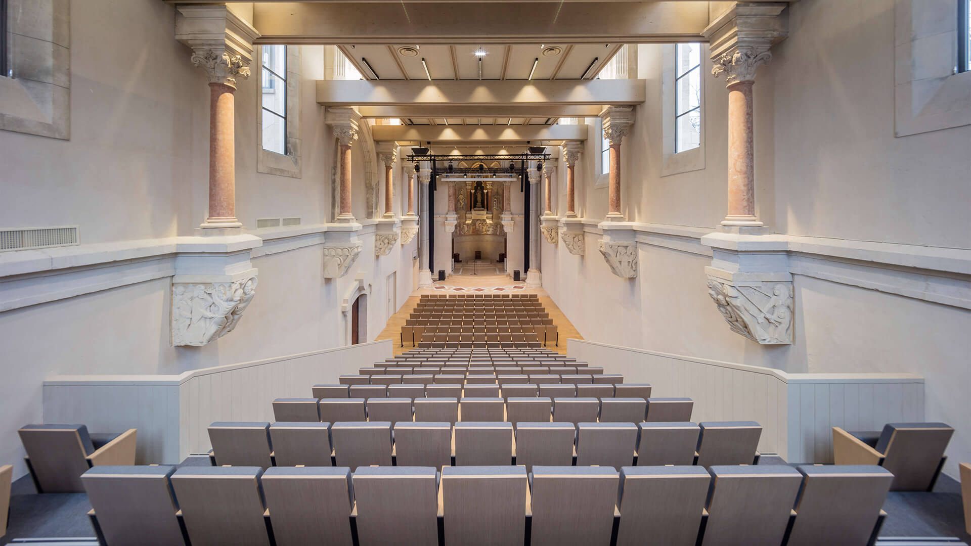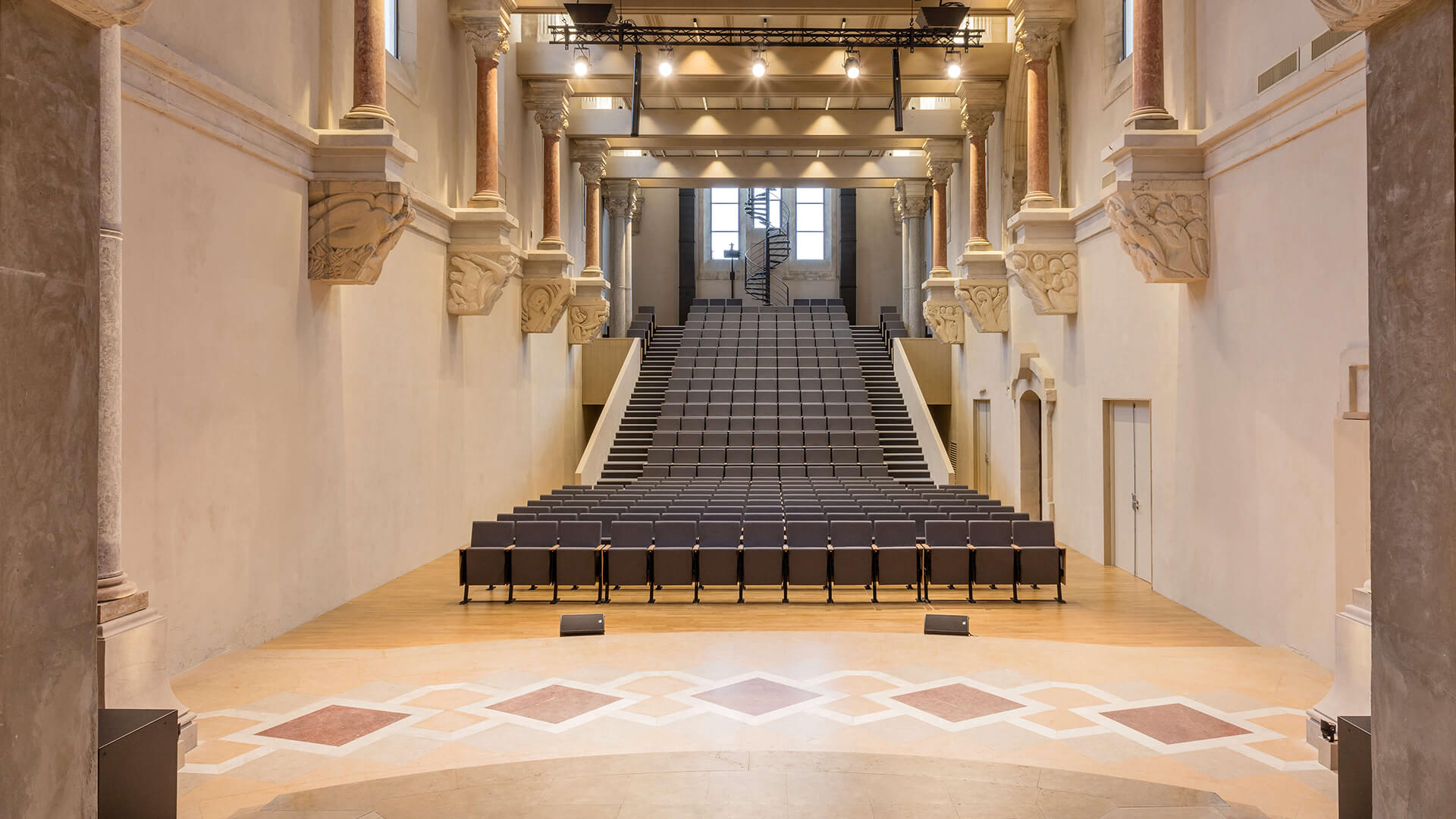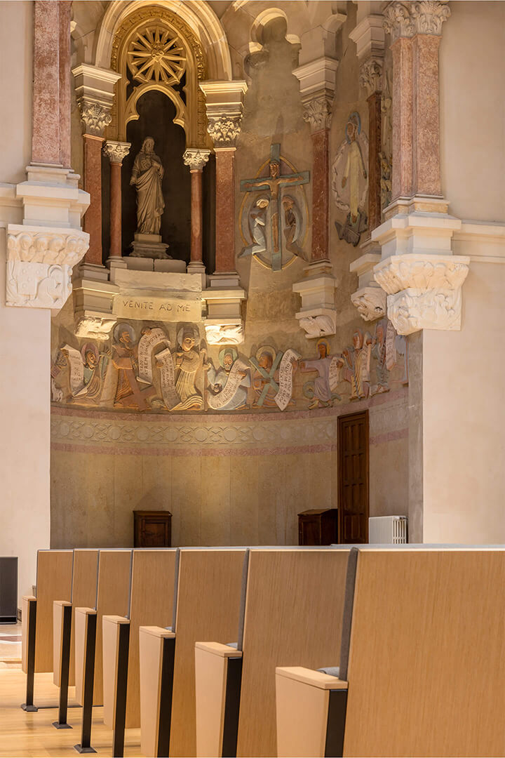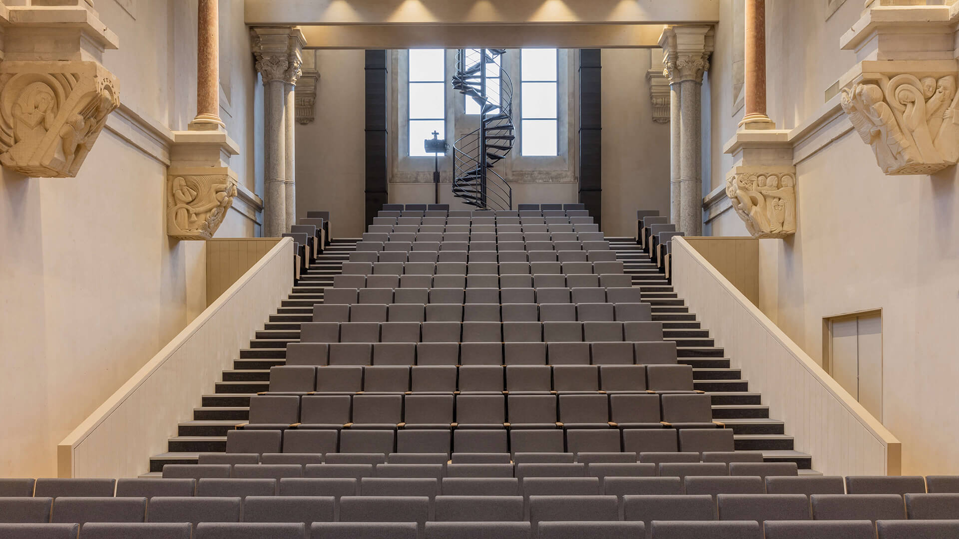 El campus, que alberga a más de 700 alumnos, se inauguró en 2019 y se amplió en 2024 con importantes instalaciones: una biblioteca, un anfiteatro y un gran auditorio con capacidad para 262 personas, creado en la sugerente capilla y equipado con las butacas Divina - R&D LAMM, dispuestas en filas rectas (distancia entre ejes de 54 cm), las nueve primeras filas en el suelo plano y las dieciséis restantes en escalones.