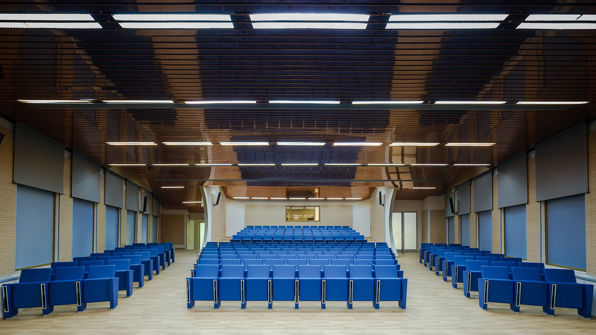 En particular, en el aula magna, caracterizada por el uso generalizado de suelos y revestimientos de madera natural, se han instalado butacas Unica (diseño de R&D LAMM).