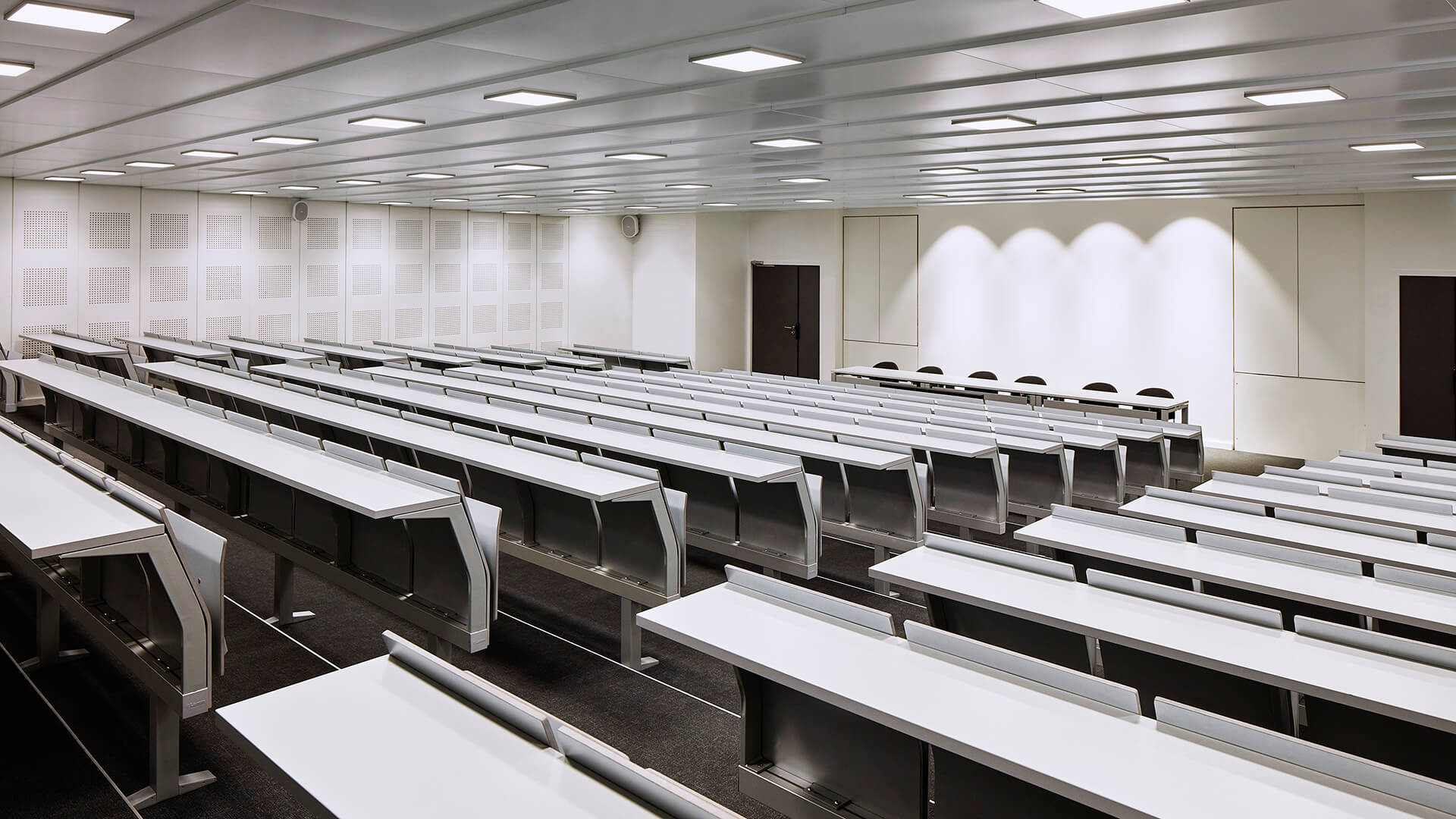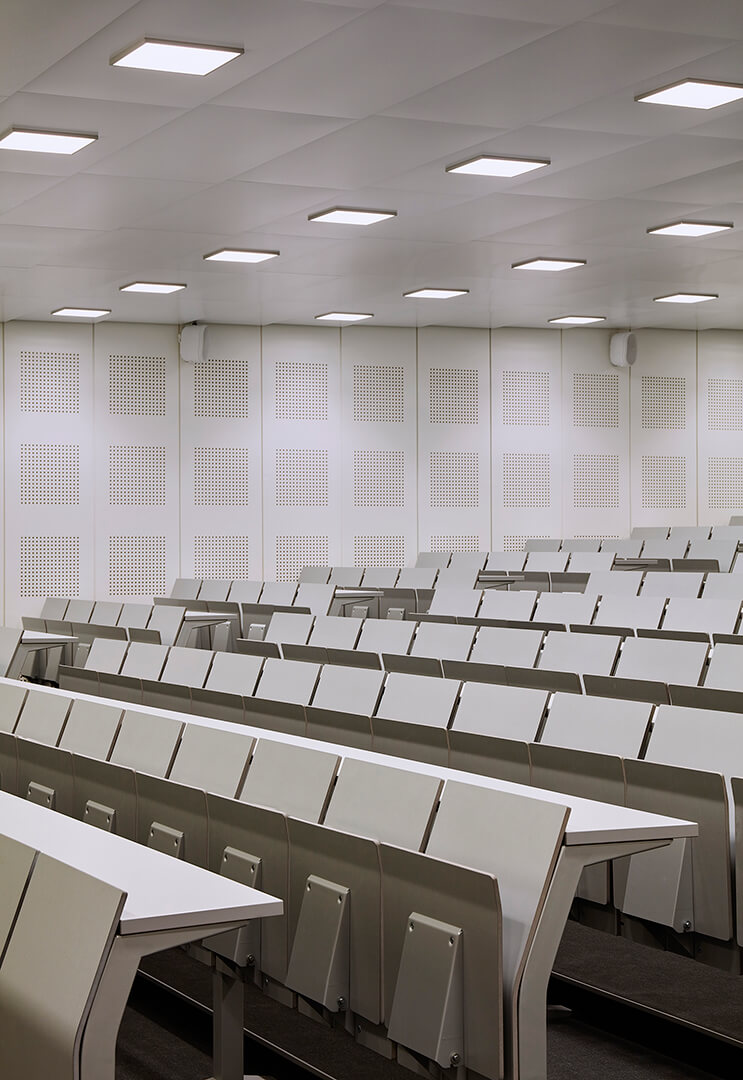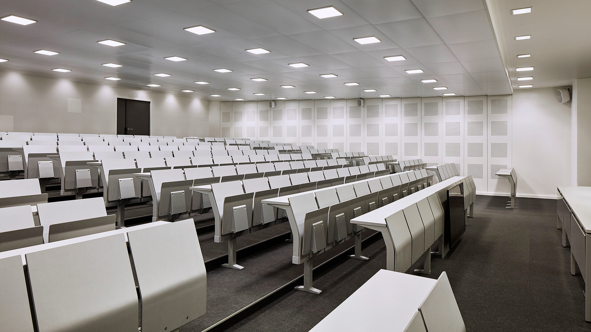 El IRA – Institut Régional d’Administration de Lyon es una de las cinco instituciones regionales de dirección administrativa de Francia (junto con las de Lille, Bastia, Metz y Nantes) que se dedican a la formación profesional y la promoción social en el sector público. Operativa desde 1970, la sede de Lyon ha sido recientemente objeto de un proyecto de rehabilitación encargado a Molnar Piccinato Sarl d’Architecture que, con su eslogan, resume de manera significativa el enfoque de sus proyectos: “Imaginamos contigo los espacios del futuro”. Entre los aspectos relevantes de la rehabilitación destaca la nueva sala de conferencias, cuya realización se ha encargado a LAMM, que ha optado por los bancos de estudio E4000 con superficie de trabajo fija, colocados en filas rectas e instalados en gradas de 9 cm de altura. Caracterizada por el elegante efecto monocromático de los tonos plateados que distinguen las estructuras metálicas y los acabados en laminado HPL de los asientos, los respaldos y las superficies de escritura, la sala de conferencias combina estándares elevados de funcionalidad, confort y accesibilidad con un cuidado diseño.