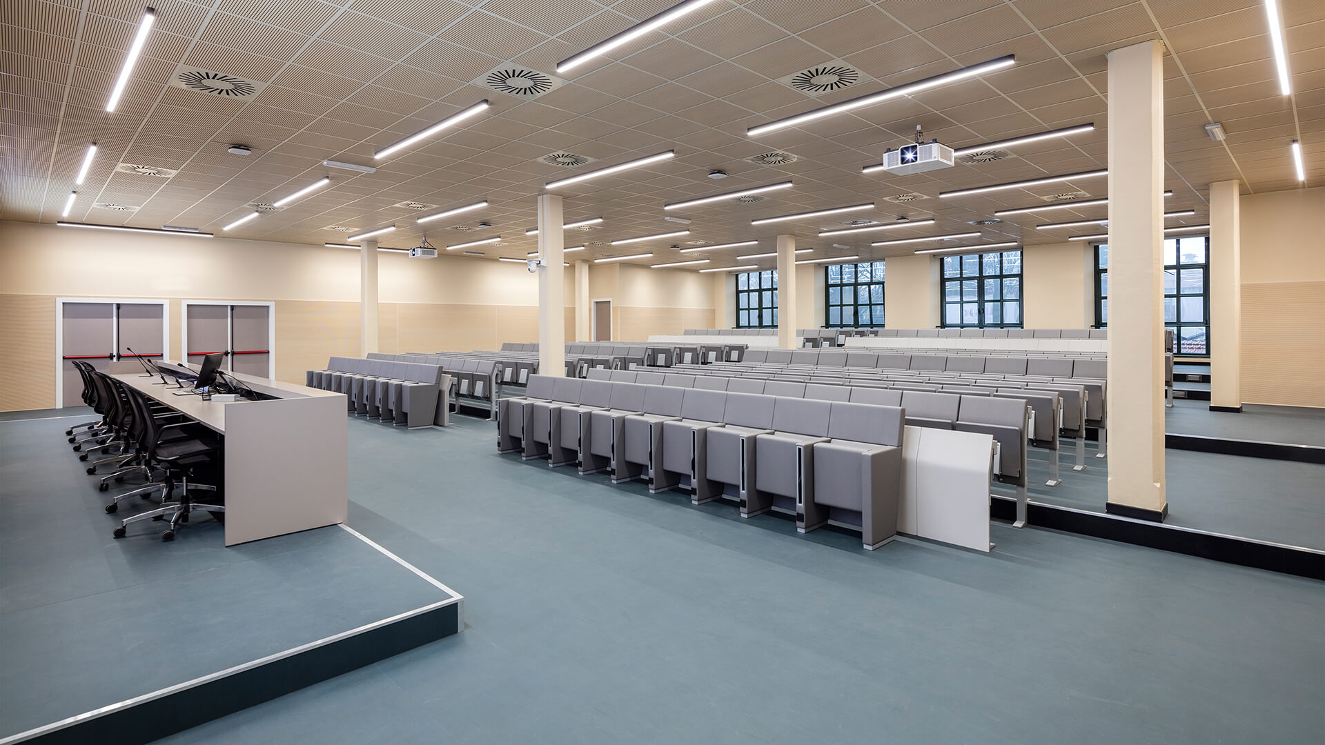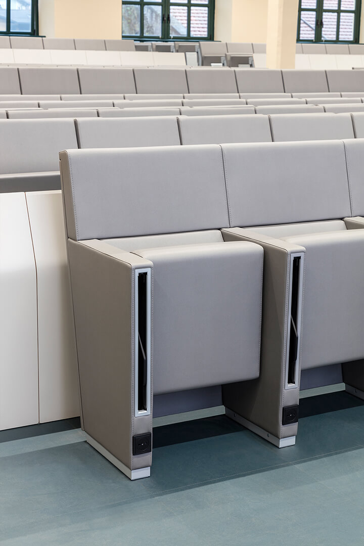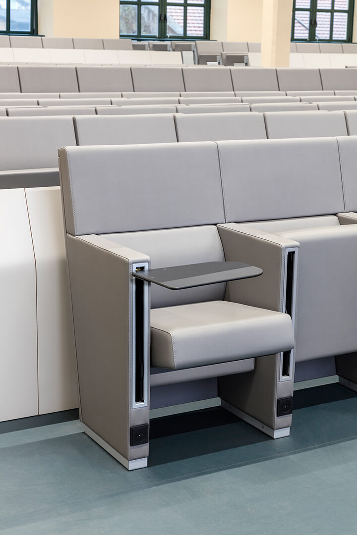 Dans la salle de classe comme au cinéma : confort maximal grâce aux fauteuils L213 pour les premières rangées et aux tables d’étude avec rembourrage surdimensionné