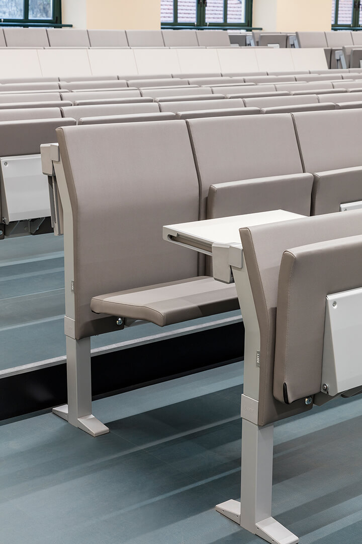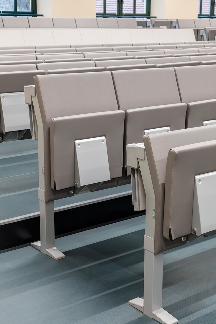 L’assise basculante, à retour automatique, est amovible et rembourrée de mousse froide. Un élégant revêtement gris Silvertex a été choisi pour l’assise et le dossier, tandis que le stratifié HPL 478 Grigio Chiaro d’ABET Laminati a été choisi pour le plateau de la tablette d’écriture et les panneaux de la première rangée (longueur au sol).