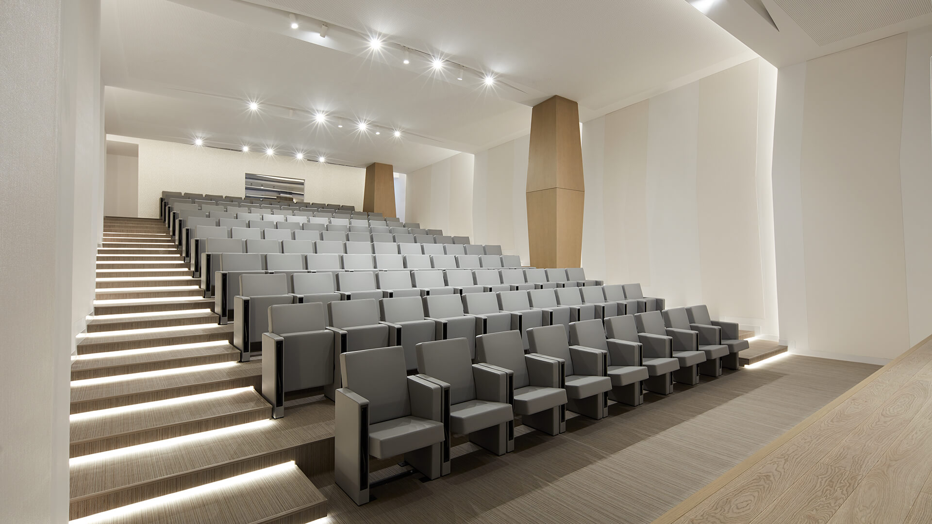 Dans la nouvelle salle polyvalente, le confort du public est garanti par 130 fauteuils de la série F50 avec assise rabattable par gravité, entièrement rembourrés et revêtus de similicuir beige. Conçus en interne, fabriqués et installés par LAMM, ils sont disposés sur gradins en 12 rangées droites, avec un entraxe de 56 cm.