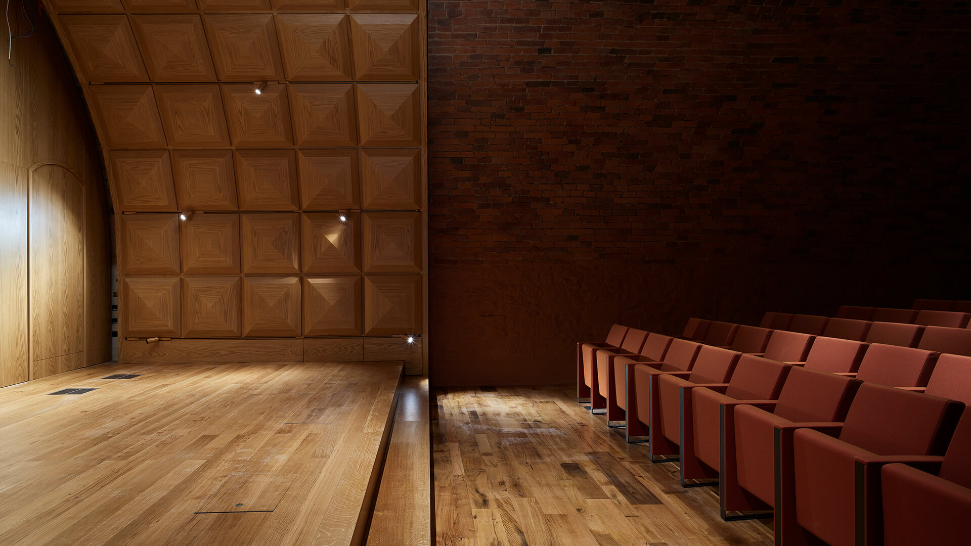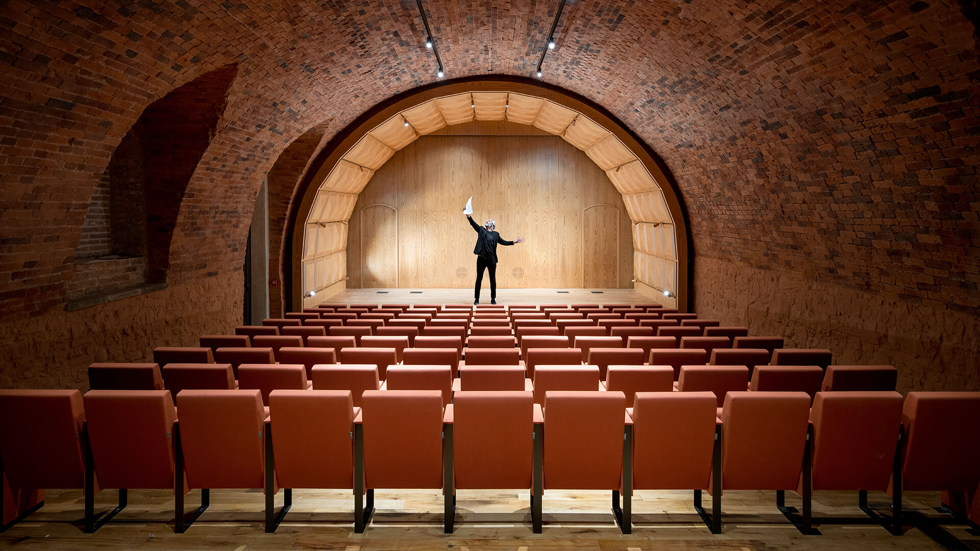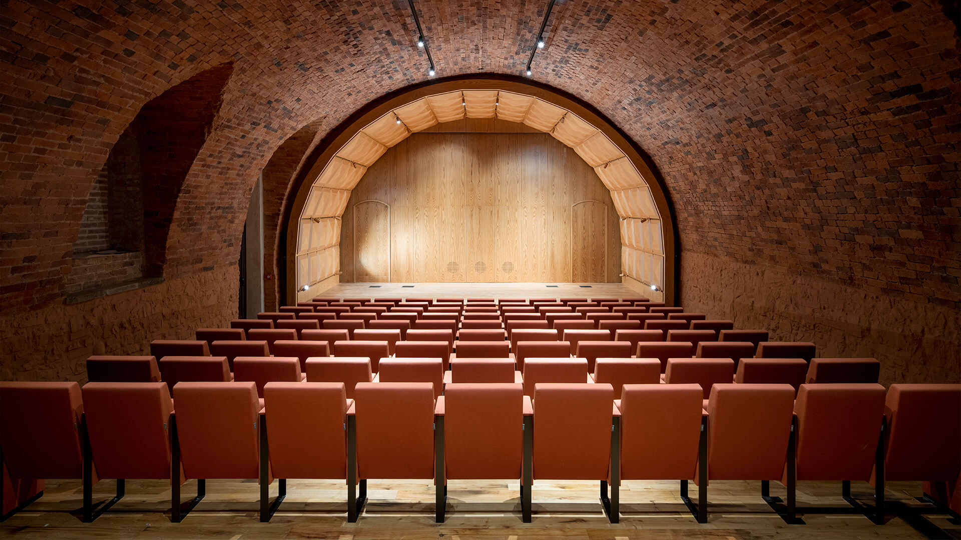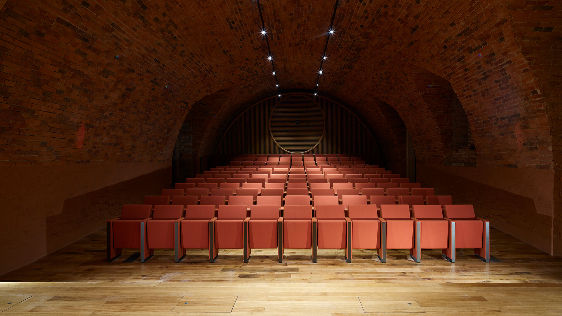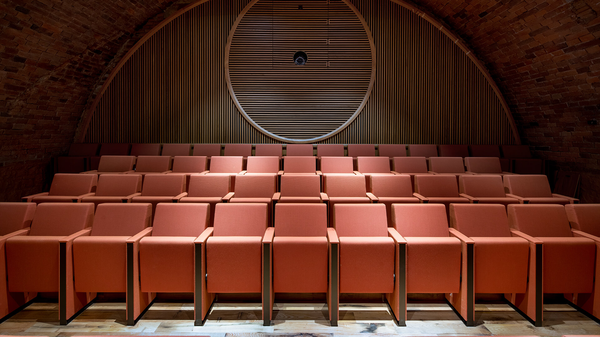 Les élégants fauteuils C100 Baldanzi & Novelli prennent ainsi place sous la superbe voûte en briques. Les assises de ce magnifique auditorium se caractérisent par un design linéaire et une capacité totale à embellir n’importe quel espace, qu’il soit historique ou contemporain. Pour ce projet, les fauteuils ont été choisis dans la version avec dossier bas dont les flancs descendent jusqu’au sol. Les fauteuils sont entièrement rembourrés et recouverts du tissu d’ameublement Kvadrat – Steelcut Trio 3. L’installation, en rangées droites, est à la fois sur sol incliné et sur gradin, avec structure ancrée au sol.