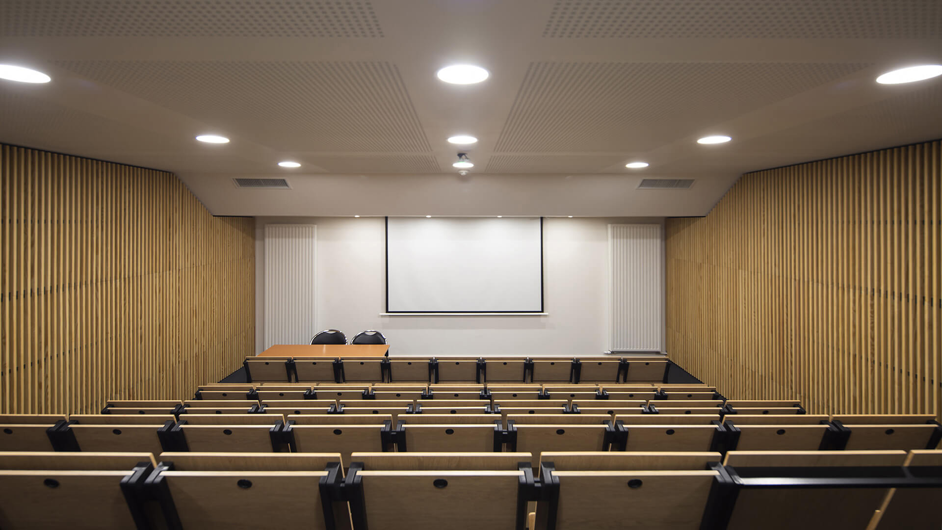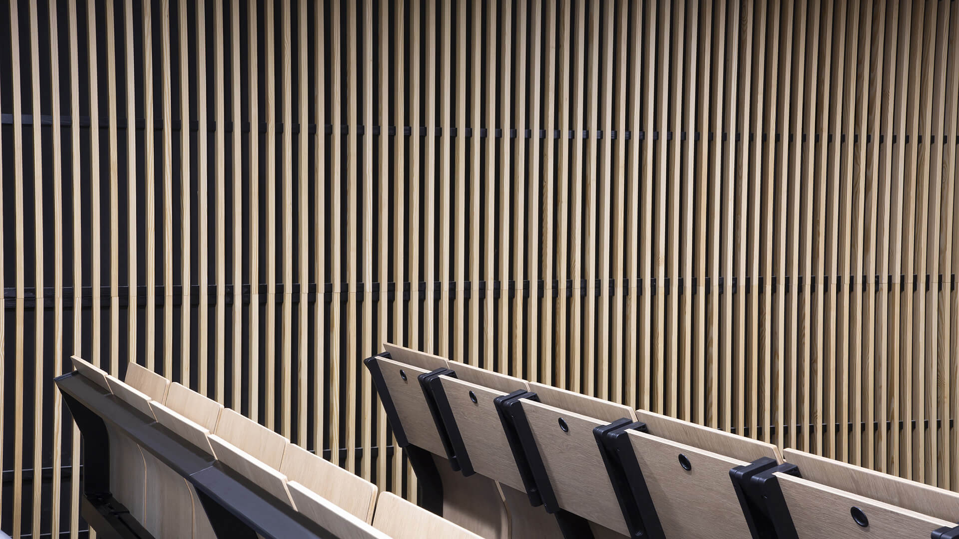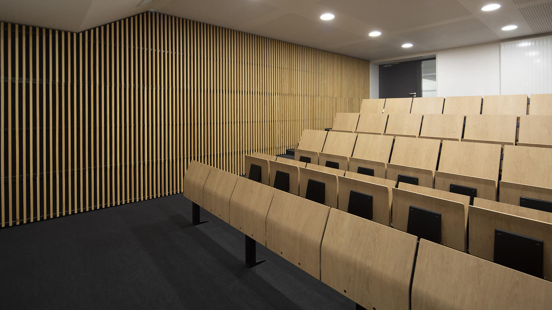 Pour le centre sportif LAuRA Foot, pôle d’excellence dédié à l’enseignement du football, LAMM a fourni 42 bancs d’étude E4000, conçus par Lucci et Orlandini. Ce système intégré de sièges et de bancs, alliant rationalité et essentialité, équipe désormais l’auditorium du grand centre sportif de Tola Vologe. Suite à la restauration d’un ensemble de bâtiments datant de l’époque de Tony Garnier, précurseur du langage rationaliste, un pôle comprenant 80 lits, des salles de classe, des vestiaires, des espaces communs et des salles de fitness destinées aux jeunes athlètes a vu le jour. Le projet, développé sous la supervision des architectes du ministère de la Culture, est signé par Bruno Saulnier Architecte. L’auditorium, environnement précieux, a été aménagé avec les bancs d’étude Lucci et Orlandini, installés en rangées droites sur des gradins, selon un entraxe de 50 cm. Équipés d’une tablette d’écriture rabattable, les bancs disposent d’un siège, d’un dossier et de surfaces en chêne stratifié Abet Laminati. Les sièges ont été choisis dans la version avec retour automatique amorti. Les structures sont peintes en noir semi-mat.