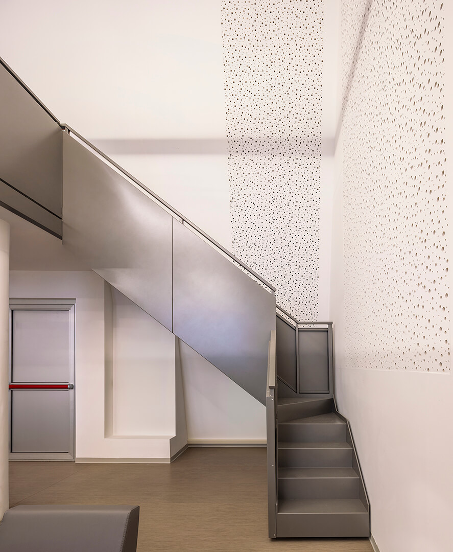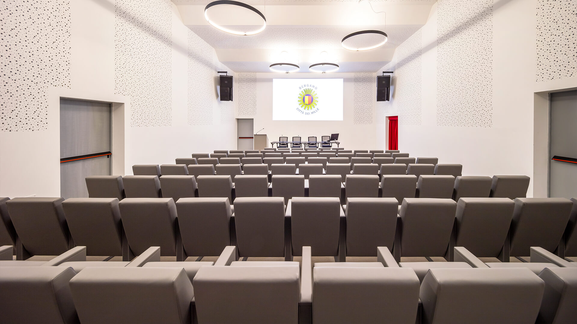 Per l’auditorium la versione scelta è quella con schienale basso e fiancata a terra. Disposte in file diritte su pavimento in piano, le sedute seguono un interasse di 56 cm. I pannelli laterali, rivestiti in similpelle grigia come il resto della seduta, sono stati scelti di lunghezza ridotta (sono disponibili in due altezze). Vasta la gamma di accessori funzionali di cui la poltrona dispone. Per la nuova sala del centro civico si è optato per la dotazione di tavolette di scrittura ribaltabili a scomparsa, con movimento antipanico.