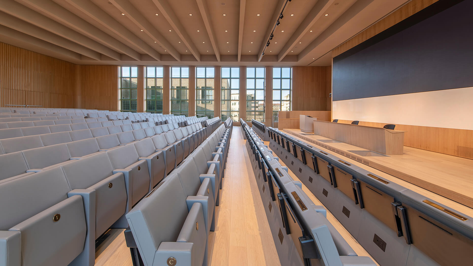 La prestigiosa Università Bocconi rinnova l’Aula Maggiore del suo primo edificio “Sarfatti 25”, progettato da Giuseppe Pagano. Intitolata a Roberto Franceschi, studente che perse la vita nel 1973 durante degli scontri avvenuti davanti all’Ateneo, l’aula è stata oggetto di lavori di adeguamento normativo e tecnologico nel rispetto dei caratteri tipici dell’architettura originaria. Contribuisce al raggiungimento degli obiettivi progettuali, la presenza di 360 poltrone Flexa – Dante Bonuccelli. Per le sedute delle prime file, la scelta è ricaduta sulla versione con fianco maggiorato per accogliere la tavoletta di scrittura ribaltabile con movimento antipanico; le restanti, con tavolino e prese nel retro-schienale, sono invece realizzate con fiancata ridotta. Tutte le poltrone utilizzano legni 100% certificati FSC® C134805 e sono rivestite in simil-pelle. La fornitura ha compreso anche quattro moduli speciali per persone con disabilità e una pedana fissa con parti piane e in rampa.