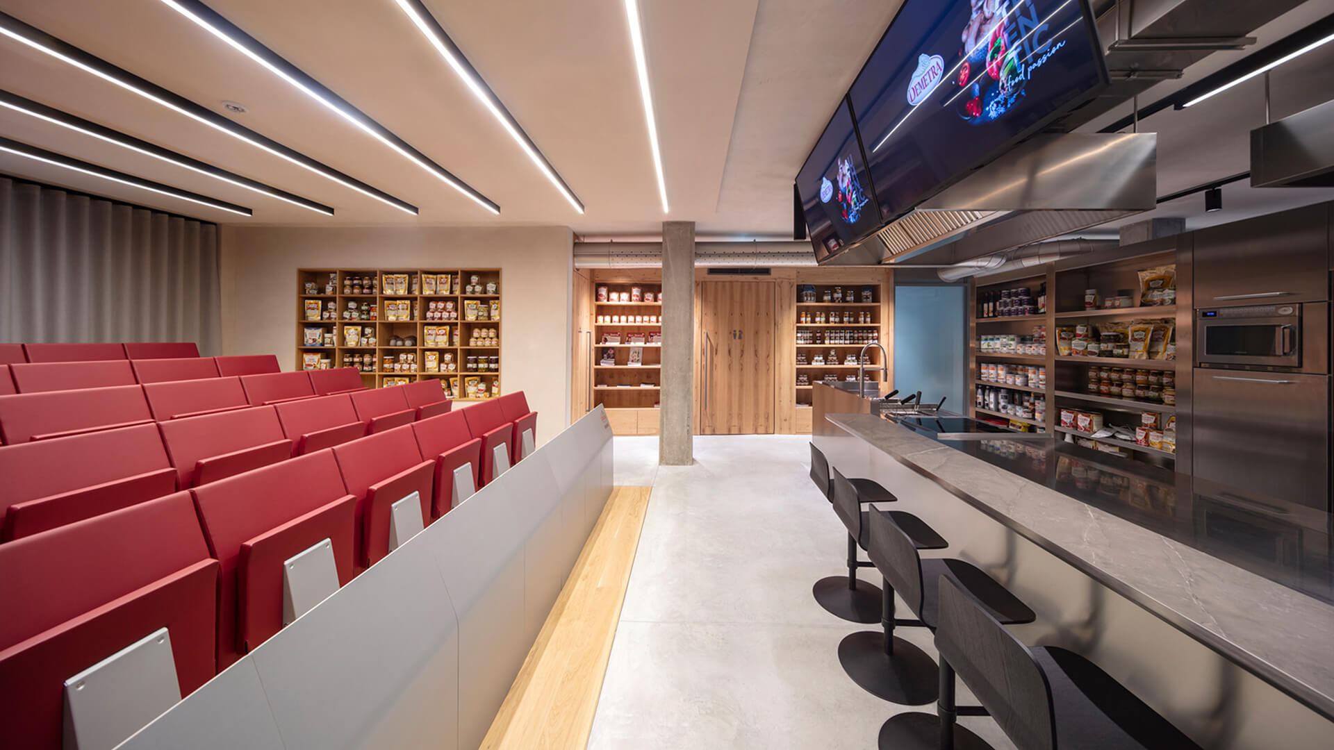Sede dei cooking show destinati agli operatori del settore è la sala della nuova Food Academy realizzata nella sede di Demetra a Talamona, in Bassa Valtellina. Nel teatro-cucina, concepito dall’architetto Fabio Rabbiosi, LAMM ha allestito la sala realizzando la tribuna fissa e installando i propri banchi studio E5000 – Orlandini design. A caratterizzarli sono l’ampia flessibilità compositiva e le comode sedute con imbottitura maggiorata. Per la Food Academy i banchi studio sono stati installati in file diritte su gradoni, con un interasse di 58 cm. I piani di scrittura, di tipo ribaltabile, e i pannelli frontali con lunghezza fino a terra, sono stati scelti nella versione in laminato argento. Sedili e schienali, rivestiti in similpelle bordeaux, vivacizzano l’ambiente. Massimo comfort per la seduta, dotata anche di ritorno automatico ammortizzato.