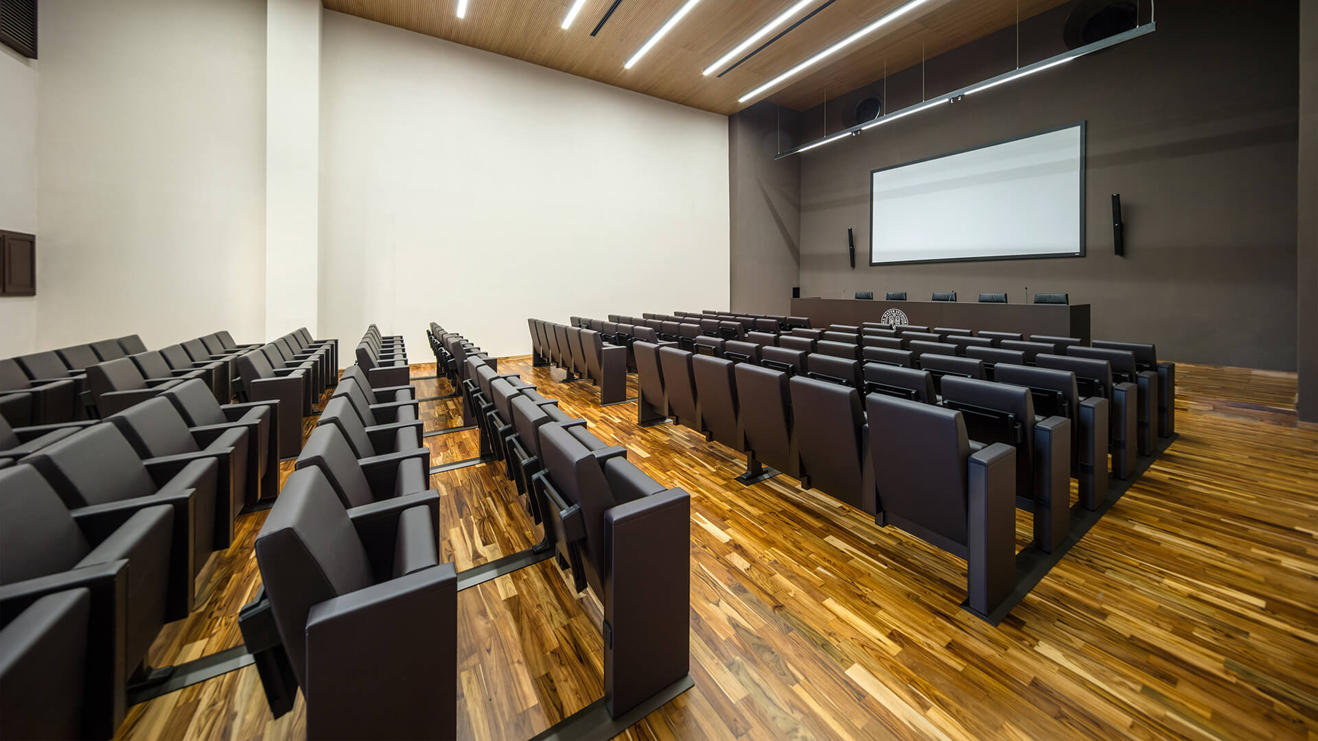 The 122 seats were arranged in straight rows on the floor, mounted on a beam to prevent damage to the flooring. The first-row seats are equipped with tip-up foldaway writing tables with anti-panic movement. For the remaining rows, the support surface consists of tip-up backrest tables with a soft closing system (Patent Pending). Each table is equipped with an electrical outlet located on the side panels. In the first row only, the sockets are also present on the beam.