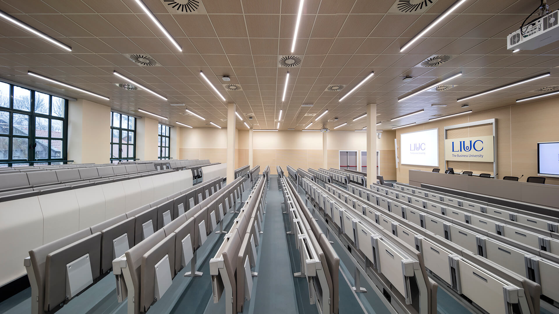 Incessant research and innovation applied to the products: the new E5000 - Orlandini Design study desks are equipped with a folding table with soft-close mechanism that makes its debut in the 300-plus-seat lecture hall of the LIUC - Carlo Cattaneo University in Castellanza (Varese), named after the Italian historian, economist and politician Camillo Bussolati, in the splendid campus created from a former cotton mill and designed by Aldo Rossi, the well-known architect, theorist and artist, compared to Le Corbusier as a painter-architect, and winner in 1990 of the Pritzker Prize, the Nobel Prize for architecture. Contributing to the creation of an elegant environment is the essential design of the L213 - R&D LAMM armchairs.